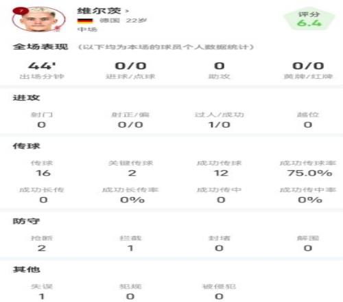 維爾茨在這場比賽里,出戰(zhàn)44分鐘,沒有1次射門,1次嘗試過人卻沒能成功。