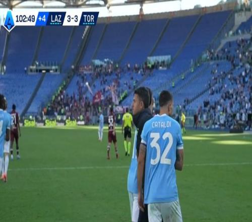 但比賽第95分,拉齊奧隊(duì)諾斯林禁區(qū)內(nèi)被撞到,裁判觀看VAR后判罰點(diǎn)球。此時(shí)時(shí)間來到103分鐘,拉齊奧由卡塔爾迪點(diǎn)球打進(jìn)扳平比分,最終補(bǔ)時(shí)階段拉齊奧搶回一分。