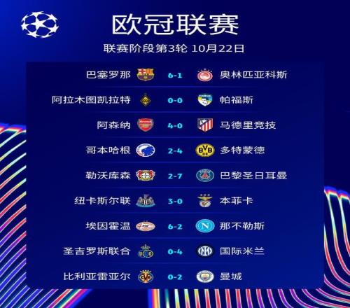 10月22日凌晨,歐冠聯(lián)賽階段第3輪第1比賽日結(jié)束9場爭奪。本輪比賽上演進球狂潮,多場比賽打出高比分。巴塞羅那主場6-1大勝奧林匹亞科斯,衛(wèi)冕冠軍大巴黎7-2狂勝勒沃庫森,埃因霍溫6-2擊敗了那不勒斯。