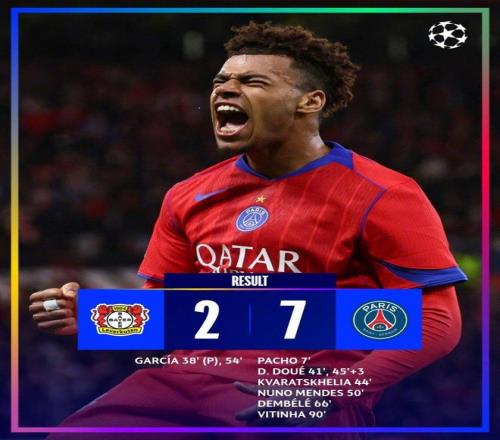 上半場比賽安德里希和扎巴爾尼先后被紅牌罰下,兩隊在場上均10人作戰(zhàn)。大巴黎在半場4-1大比分領(lǐng)先勒沃庫森,下半場比賽大巴黎攻勢不減,繼續(xù)門德斯、登貝萊和維蒂尼亞又先后取得進球,7-2贏下了這場進球大戰(zhàn)的勝利。