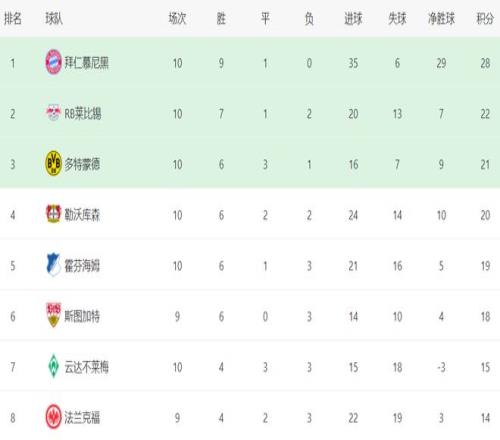 在積分榜上,拜仁以28分排名榜首,戰(zhàn)績是9勝1平,是德甲唯一保持不敗的球隊。萊比錫以22分排名第2,落后6分。多特蒙德排名第3,拿到21分。勒沃庫森大勝之后縮小與身前球隊的差距,以20分排名第4。霍芬海姆拿到19分,排名第5。第6的是斯圖加特,拿到18個積分。