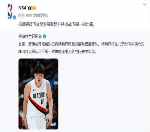 11月14日,NBA波特蘭開拓者隊官方宣布,已將楊瀚森派至發(fā)展聯(lián)盟混音隊。楊瀚森將在北京時間本周六對陣山谷太陽隊和下周一對陣南灣湖人隊的比賽中出場。