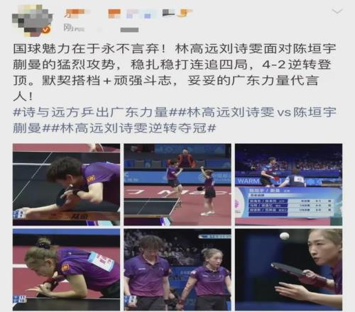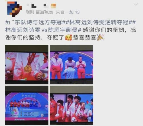 在14日晚結(jié)束的混雙決賽中,廣東隊組合林高遠/劉詩雯以4:2(局分:13-15、8-11、11-8、11-8、11-8、12-10)戰(zhàn)勝江蘇隊組合陳垣宇/蒯曼,奪得冠軍!